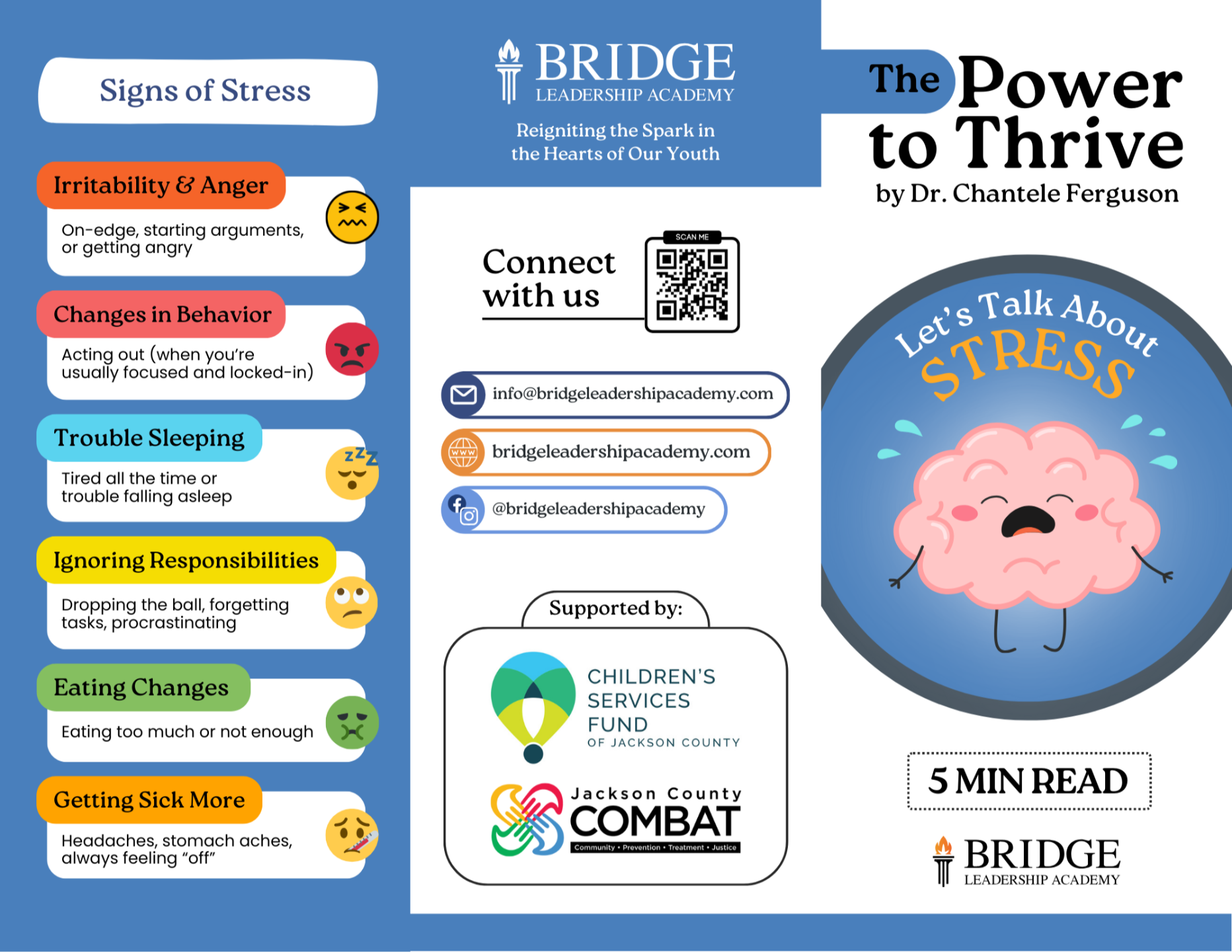 The Power to Thrive series is a new mental health resource developed by The Bridge Leadership Academy and Dr. Chantele Ferguson. Three kid-friendly brochures cover three topics: Stress, Mindfulness, and Mindset. In addition, stickers of each subject direct readers via a QR code to view the material in a digital format.